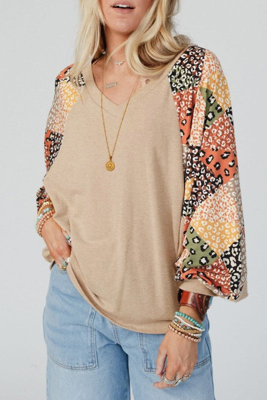 Contrast Raglan Sleeves Patchwork V Neck Top