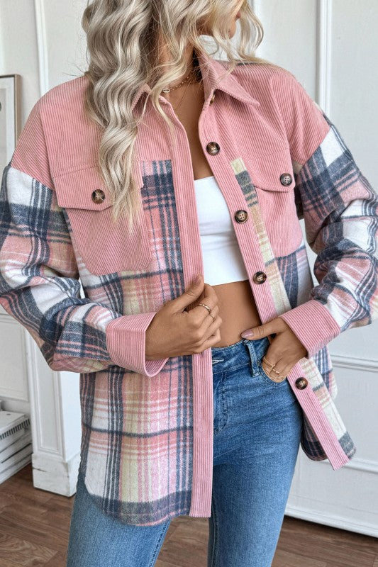 Plaid Corduroy Patchwork Pocket Loose Shacket