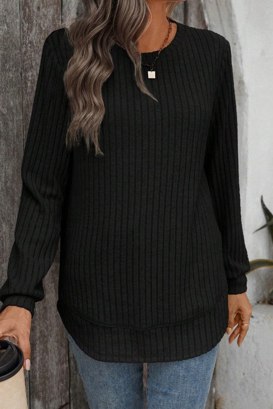 Ribbed Texture Round Neck Rounded Hem Knit Top