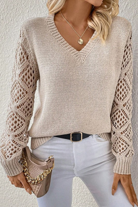 V Neck Pointelle Knit Sleeve Contrasted Sweater